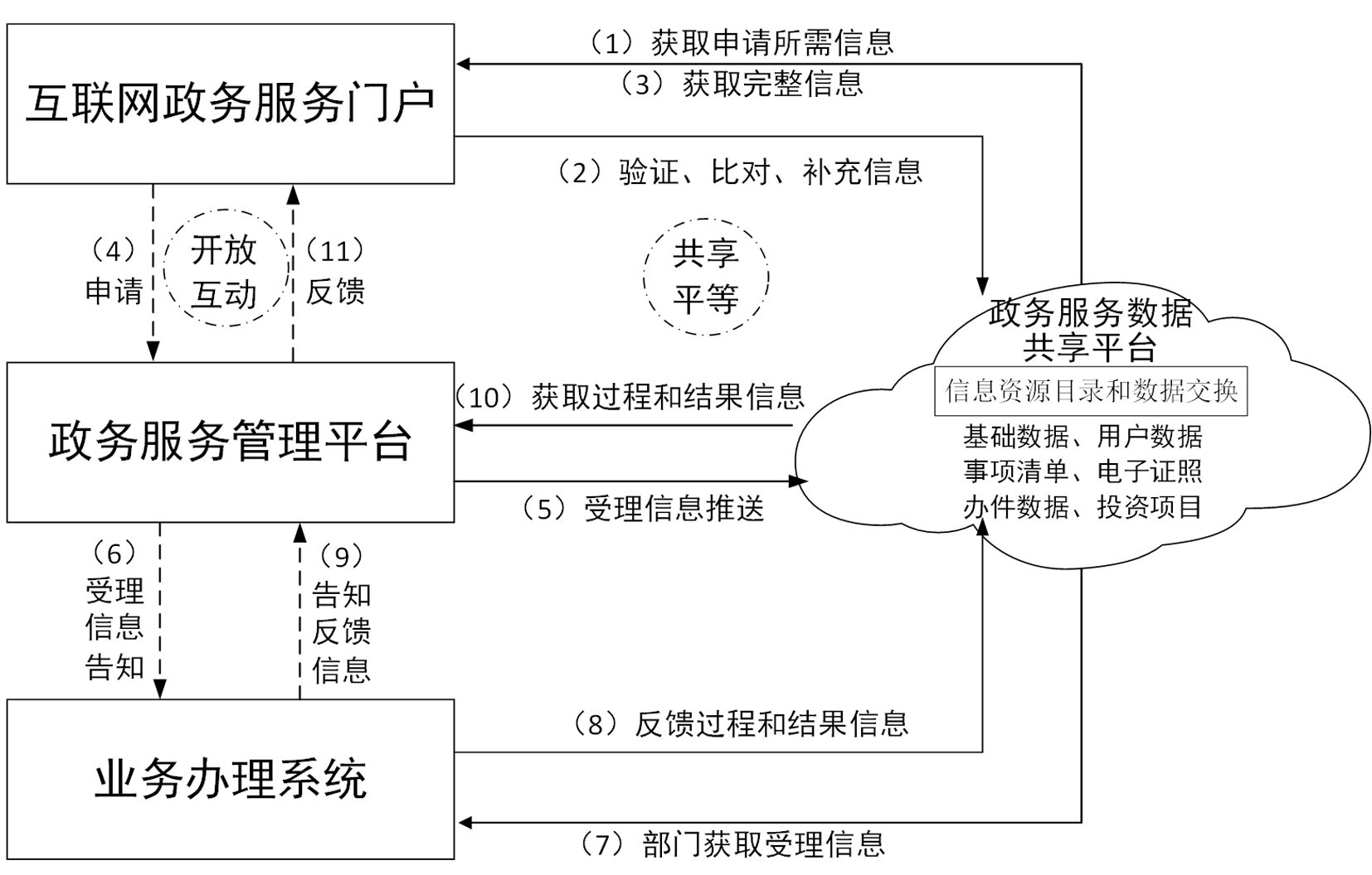 (二)业务流程 天天看高清影视在线官网业务办理全过程依托天天看高清影视在线官网数据共享平台支撑,业务数据在互联网天天看高清影视在线官网门户、天天看高清影视在线官网管理平台、业务办理系统之间流转,具体全过程业务流程示意图如图3—6所示。 用户注册登录、用户空间信息维护、天天看高清影视在线官网事项定位和查询,以及天天看高清影视在线官网的网上预约、申请、过程管理、办理反馈和互动咨询功能在互联网天天看高清影视在线官网门户实现;服务引导、天天看高清影视在线官网事项受理、协同审批、事项办结和互动反馈功能在天天看高清影视在线官网管理平台实现。业务办理系统对申请表、附件材料、受理信息的抓取,对过程信息、审批结果和电子证照的发送通过天天看高清影视在线官网数据共享平台完成。 图3-6 “互联网+天天看高清影视在线官网”平台业务流程图