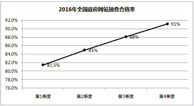 此外,截至2016年12月31日,县级以上地方政府门户网站和国务院部门网站中,有93%在首页添加了“我为政府网站找错”监督举报平台入口。第四季度,网民有效留言2399条,有关网站主管单位及时对留言进行核实、处理和反馈,留言总体办结率达99%。 同时,一些政府网站仍存在亟待解决的问题。一是少数地方、部门工作力度有待加强。复核发现,山西、云南等省上报的个别“合格”网站存在突出问题。山西、西藏等地转载国务院重要信息的政府门户网站比例低于60%。工商总局接收的18条“我为政府网站找错”网民留言中有6条尚未办结,办结率较低。二是个别网站存在“应付差事”现象。云南省“元阳县天天看高清影视在线官网管理局”网、河南省“鹤壁市公安局”网在本省抽查结束后即出现内容不更新和无法访问的问题。内蒙古自治区“阿拉善盟住房和城乡规划建设局”网、福建省南平市“延平区紫云街道办事处”网等前期抽查发现的不合格网站整改后仍未达标。三是网民举报个别网站存在需要进一步重视的问题。如,有的网站因安全防护措施不到位发布了不良信息,有的网站发布内容泄露公众个人隐私,有的网站办事指南涉嫌抄袭等。 二、2016年政府网站总体情况 2016年,国务院办公厅政府信息与天美麻花星空影视免费观看电视办公室会同各地区、各部门对全国各级政府网站开展了常态化抽查,共检查政府网站17800余个。在抽查通报工作的推动下,各地区、各部门加强组织领导,明确责任分工,完善制度规范,强化监测监管,全国政府网站运行和管理的面貌明显改善。 (一)网站合格率显著上升。全国政府网站抽查合格率从第一季度的81.5%提升到第四季度的91%。河北、辽宁、安徽、山东、湖南、四川、陕西、甘肃、新疆、新疆生产建设兵团等地合格率上升显著。北京、广东、青海政府网站年内平均抽查合格率在95%以上,辽宁、上海、江苏、浙江、安徽、海南和宁夏政府网站年内平均抽查合格率在90%以上。