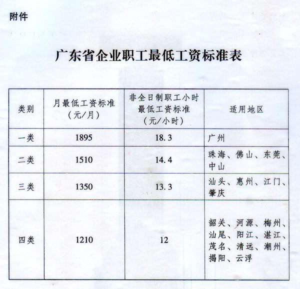 附件:广东省企业职工最低工资标准表