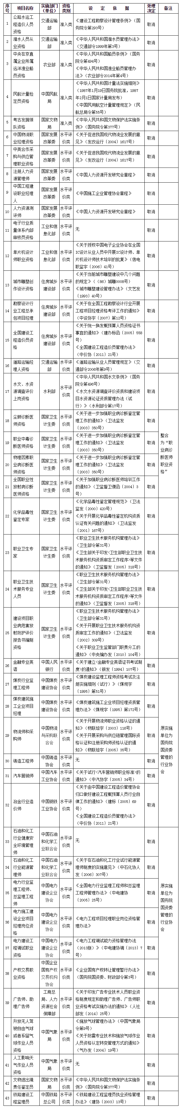 国发〔2016〕5号 经研究论证,国务院决定取消61项职业资格许可和认定事项,现予公布。同时,建议取消1项依据有关法律设立的职业资格许可和认定事项,国务院将依照法定程序提请全国人民代表大会常务委员会修订相关法律规定。