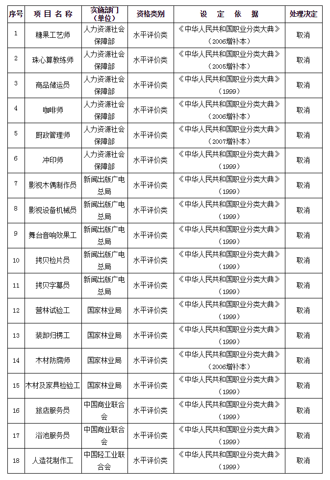 附件 国务院决定取消的职业资格许可和认定事项目录(共计61项) 一、取消的专业技术人员职业资格许可和认定事项(共计43项,其中准入类5项,水平评价类38项) 二、取消的技能人员职业资格许可和认定事项(共计18项,均为水平评价类) |