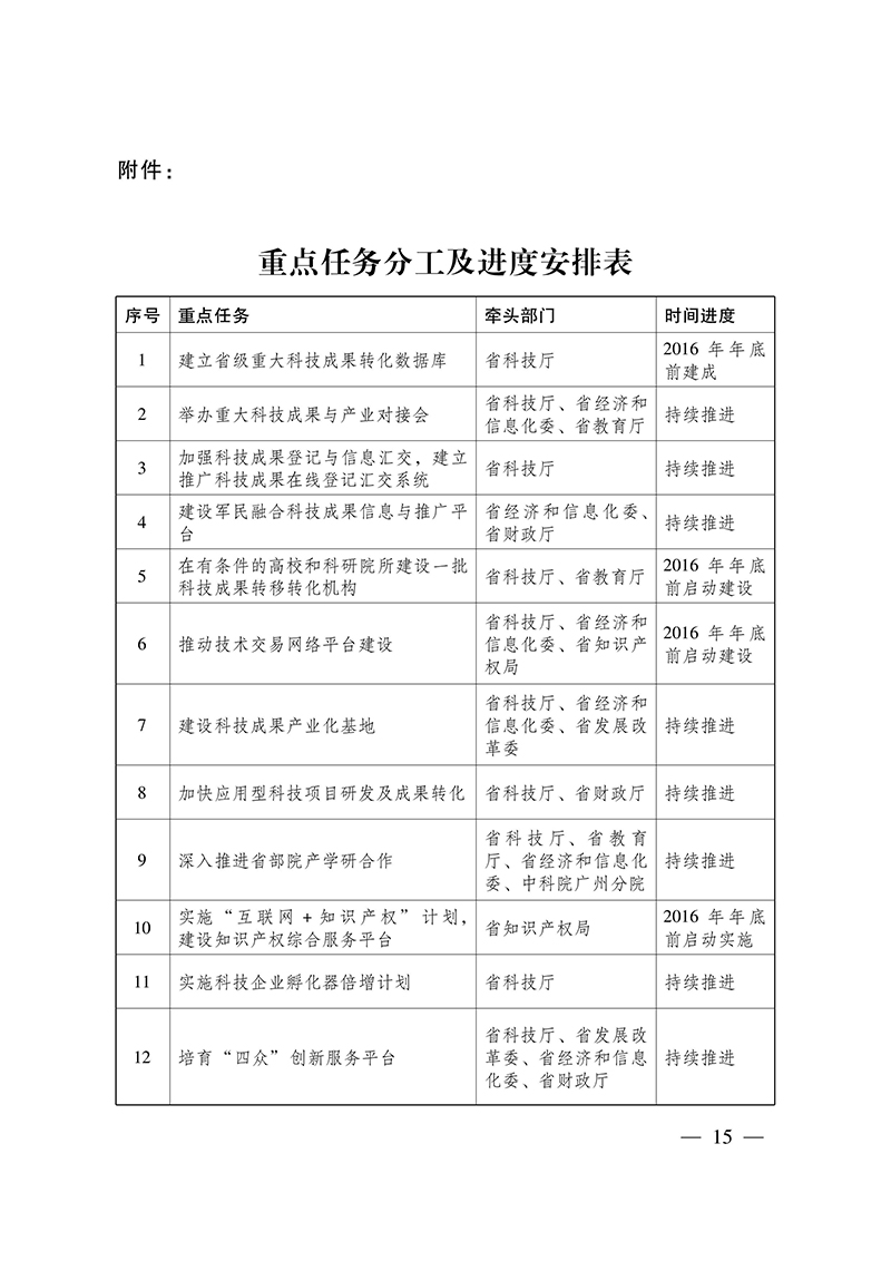 广东省人民政府办公厅关于进一步促进 科技成果转移转化的实施意见 各地级以上市人民政府,各县(市、区)人民政府,省政府各部门、各直属机构: 为贯彻落实《中华人民共和国促进科技成果转化法》、《国务院关于印发实施〈中华人民共和国促进科技成果转化法〉若干规定的通知》(国发〔2016〕16号)、《国务院办公厅关于印发促进科技成果转移转化行动方案的通知》(国办发〔2016〕28号)精神,进一步促进科技与经济的融合发展,加快推动科技成果转化为现实生产力,推动我省经济转型升级、提质增效,经省人民政府同意,提出以下实施意见。 一、加强科技成果信息交汇与发布 (一)加快建立重大科技成果转化数据库。围绕高端新型电子信息、生物医药、高端装备制造、节能环保、新材料、新能源、LED、新能源汽车等重点领域,建立重大科技成果转化数据库,为科技成果转化提供信息支持。制定重大科技成果信息采集与服务规范,征集梳理各领域的重大科技成果入库。举办多层次、多渠道的重大科技成果与产业对接会,支持行业骨干企业、产业技术创新联盟牵头推进我省重点领域的重大科技成果转移转化应用。发挥财政资金引导作用和科技中介机构的成果筛选、市场化评估、融资服务、成果推介等作用,鼓励企业探索新的商业模式和科技成果产业化路径,加速重大科技成果转化应用。 (二)加强科技成果登记与信息交汇。建立推广科技成果在线登记交汇系统,畅通科技成果信息收集渠道。凡执行各类科技计划产生并通过验收、鉴定、评估等成果评价的科技成果必须登记,计划外非财政投入产生的已通过成果评价的科技成果自愿登记。加强科技成果管理与科技计划项目管理的有机衔接,明确由财政资金设立的应用类科技项目承担单位的科技成果转化义务。完善全省科技成果信息公开规范制度和科技报告制度,建设统一的科技成果信息公开平台,除涉及国家安全、重大社会公共利益和商业秘密外,向社会公布科技成果和相关知识信息,提供科技成果信息查询、筛选等公益服务。 (三)推动科技成果数据资源开发利用。鼓励各类技术转移服务机构运用大数据、云计算等新一代信息技术,开展科技成果信息增值服务,提供符合用户需求的精准科技成果信息。开展科技成果转化为技术标准试点,推动更多应用类科技成果转化为技术标准。加强科技成果、科技报告、科技文献、知识产权等信息化关联,各地、各部门在规划制定、计划管理、战略研究等方面要充分利用科技成果资源。加强各地科技成果交易平台与全省科技成果信息公开平台的对接,拓宽重大科技成果发布渠道。 (四)推动军民科技成果融合转化应用。建设军民融合科技成果信息与推广平台,推动驻粤各军兵种军代室在平台设点。鼓励我省院校、科研院所、企业在国家军民融合公共服务平台等载体上注册及接收、发布科研成果信息。依托军民融合数据中心,定期遴选编制军民融合技术与产品推荐目录手册,实施军工技术推广专项,推动国防科技成果向民用领域转化应用。 二、推进科技成果转移转化载体建设 (五)引导建立各类科技成果转化服务机构。鼓励珠三角有条件的地市建设国家技术转移中心,培育发展国家级和省级技术转移示范机构,并实施监测评估和动态管理。鼓励有条件的高校和科研院所建立健全专业化、市场化的科技成果转移转化机构,推动科技成果与企业需求有效对接。支持企业与高校、科研院所联合建立科技成果转移转化机构,开展成果应用推广、标准制定,以及中试熟化与产业化开发等活动。实施科技成果转移转化服务奖励,鼓励科技成果转移服务机构开展技术转移服务活动。 (六)推动技术交易网络平台建设。发展和规范网上技术交易市场,集聚科技成果、知识产权、资金、人才、服务等创新要素,连接高校、科研院所、企业、投融资机构等创新主体,建设线上与线下相结合的新型技术交易服务平台,开展技术交易、技术定价、信息发布、在线服务、竞价拍卖、技术投融资、转化咨询等专业化服务。支持各地和有关机构建立完善区域性、行业性技术市场,形成不同层级、不同领域技术交易有机衔接的新格局。提升跨区域技术转移与辐射功能,打造连接省内外技术、资本、人才等创新资源的技术转移网络。建设面向技术供需方的技术产权交易平台,重点支持广州技术产权交易中心、深圳联合产权交易所等平台完善服务功能,引导民营资本和技术交易网络运营商建设新型技术交易服务平台,推动技术产权交易平台在地级以上市和高科技园区、科技成果转化服务机构设立交易窗口或服务站点,发展壮大技术交易市场。 (七)建设科技成果产业化基地。瞄准超高速无线局域网、量子通信、精准医疗、高端医疗器械、石墨烯、热超导材料、无人机技术、海洋装备制造、节能环保新技术等新兴产业领域,依托珠三角国家自主创新示范区、高新技术产业开发区以及重点科技园区等创新资源集聚区域,建设一批科技成果产业化基地,推动国内外重大科技成果在基地转化和产业化。深入推动专业镇协同创新,鼓励高校和科研院所参与专业镇协同创新中心建设,增强产业关键共性技术攻关和成果转化能力。推动产业关联度高的专业镇强强联合,建立资源整合和开放协作机制,共建产业专业合作