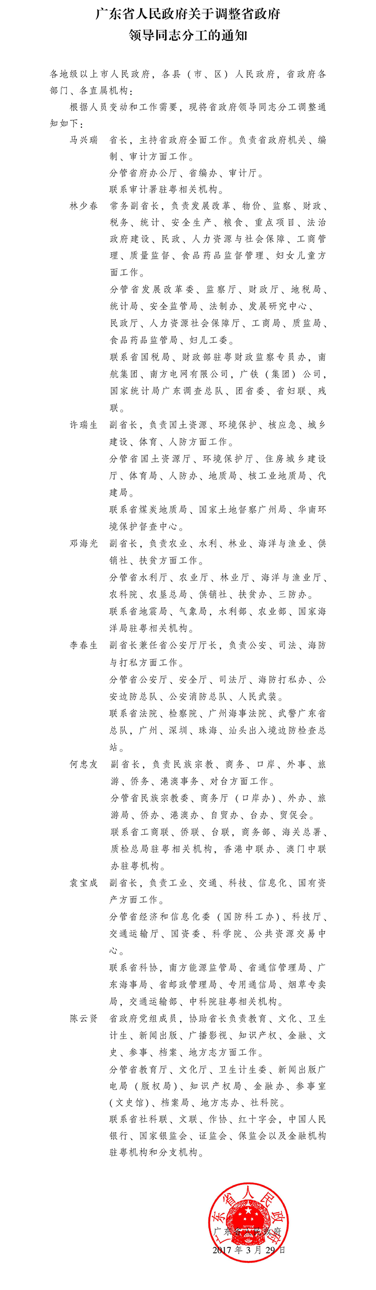 全真版:广东省人民政府关于调整省政府领导同志分工的通知
