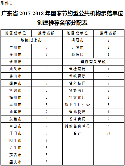 附件:1.广东省2017-2018年国家节约型公共机构示范单位创建推荐名额分配表