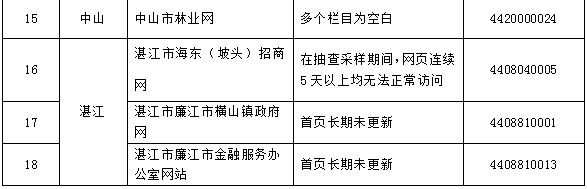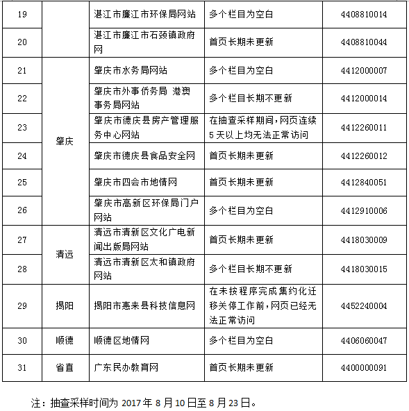 (一)部分地区和部门常态化监管乏力。我省第三季度抽查共发现存在突出问题网站31个,其中,湛江市海东(坡头)招商网、肇庆市德庆县房产管理服务中心等网站无法正常访问;河源市教育信息网、梅州市食药监局等网站首页长期未更新;河源市源城区、龙川县、东源县、肇庆市四会等多个基层地情网站首页长期未更新或多个栏目为空白。
