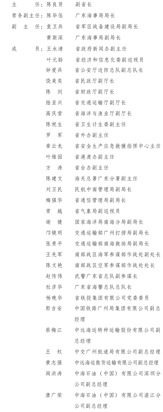 根据《广东省海上搜寻救助工作规定》(省政府令第182号)和《广东省人民政府广东省军区关于印发广东省海上险情应急预案的通知》(粤府〔2013〕123号)精神,结合工作实际和人员变动情况,省人民政府同意对省海上搜救中心成员作相应调整。现将调整后的名单通知如下: