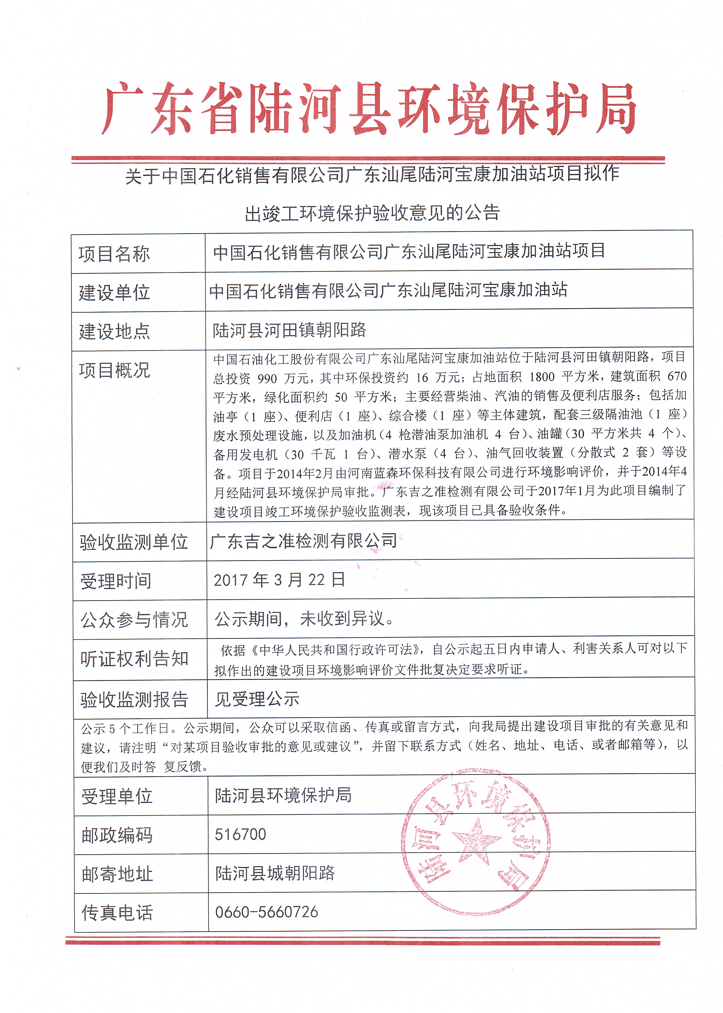 关于中国石化销售有限公司广东汕尾陆河宝康加油站项目拟作出竣工环境保护验收意见的公告