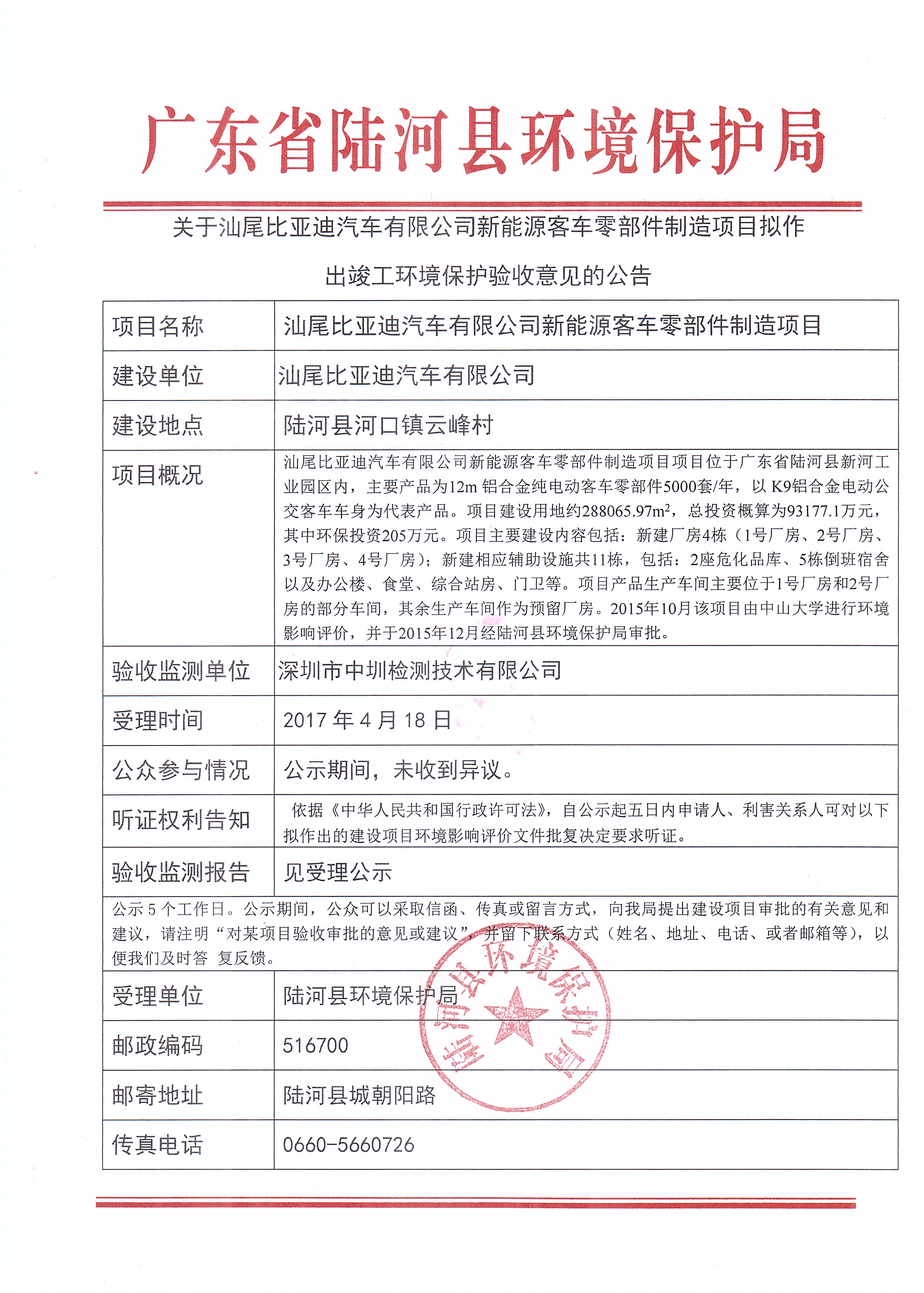 关于汕尾比亚迪汽车有限公司新能源客车零部件制造项目拟作出竣工环境保护验收意见的公告
