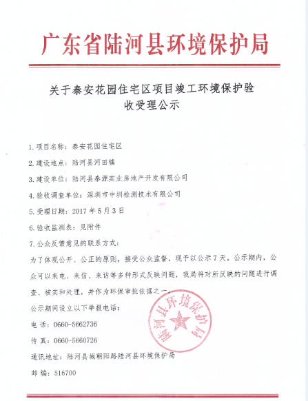 关于泰安花园住宅区项目竣工环境保护验收受理公示