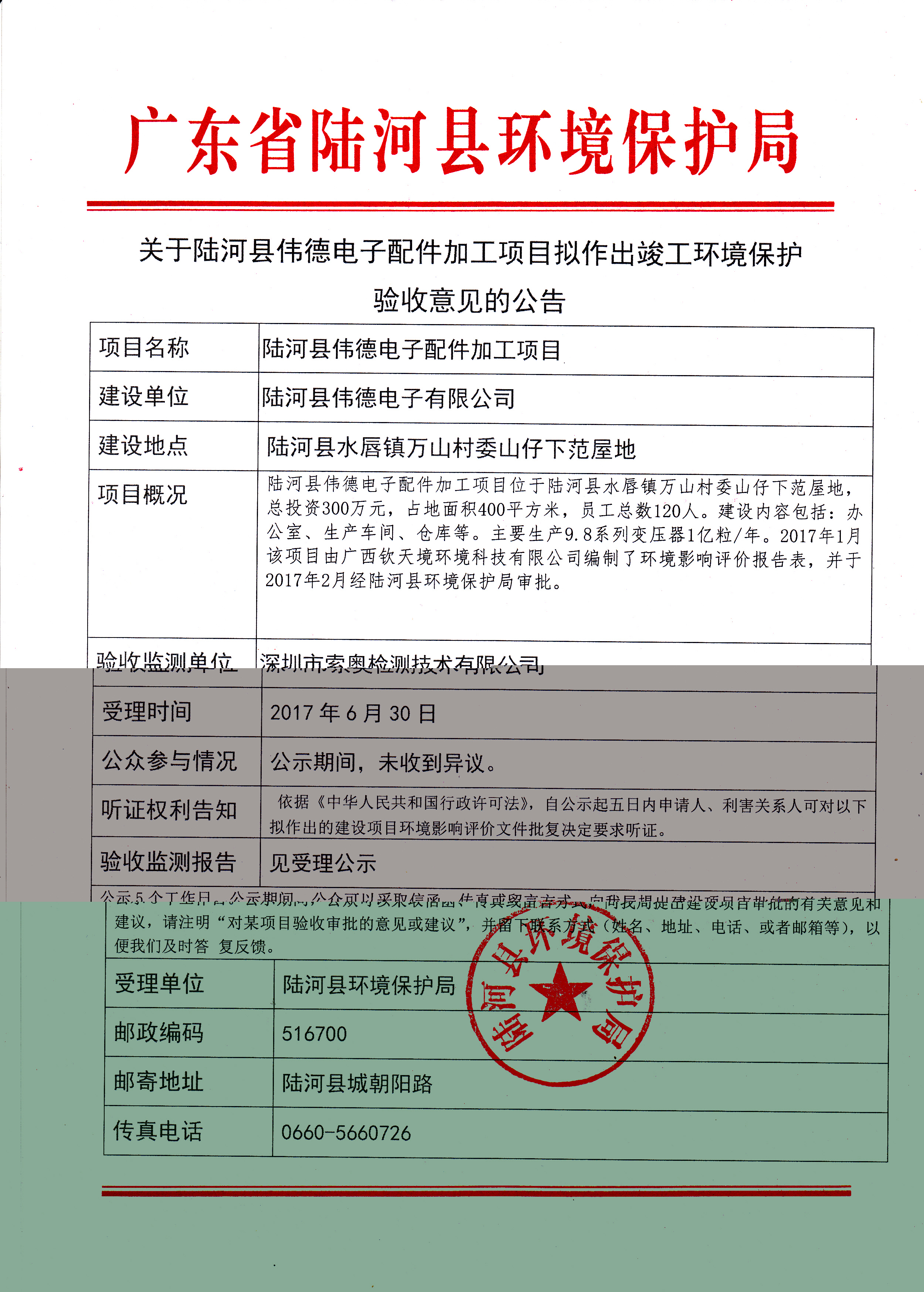关于陆河县伟德电子配件加工项目拟作出竣工环境保护验收意见的公告
