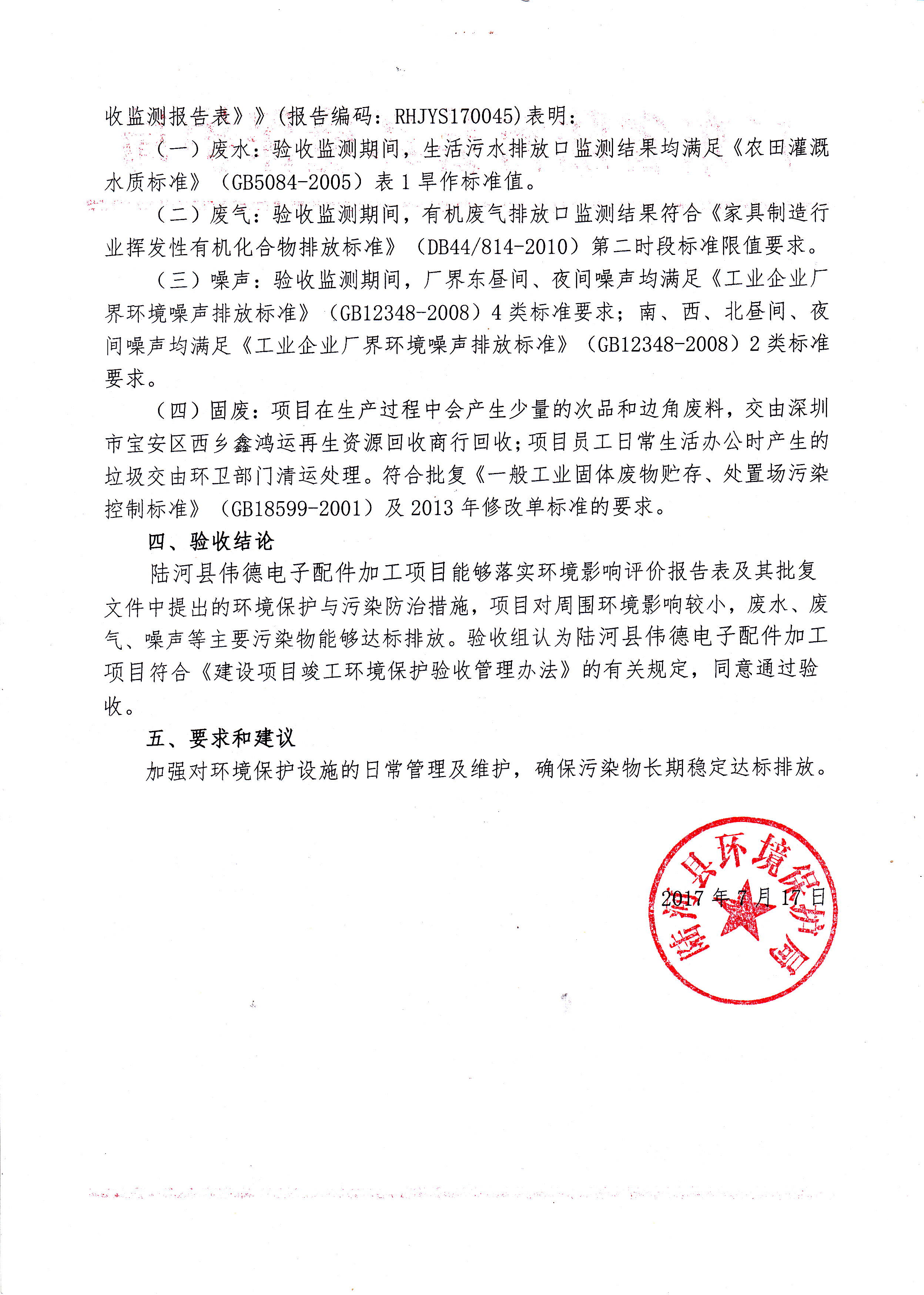 关于陆河县伟德电子配件加工项目竣工环境保护验收意见的公告