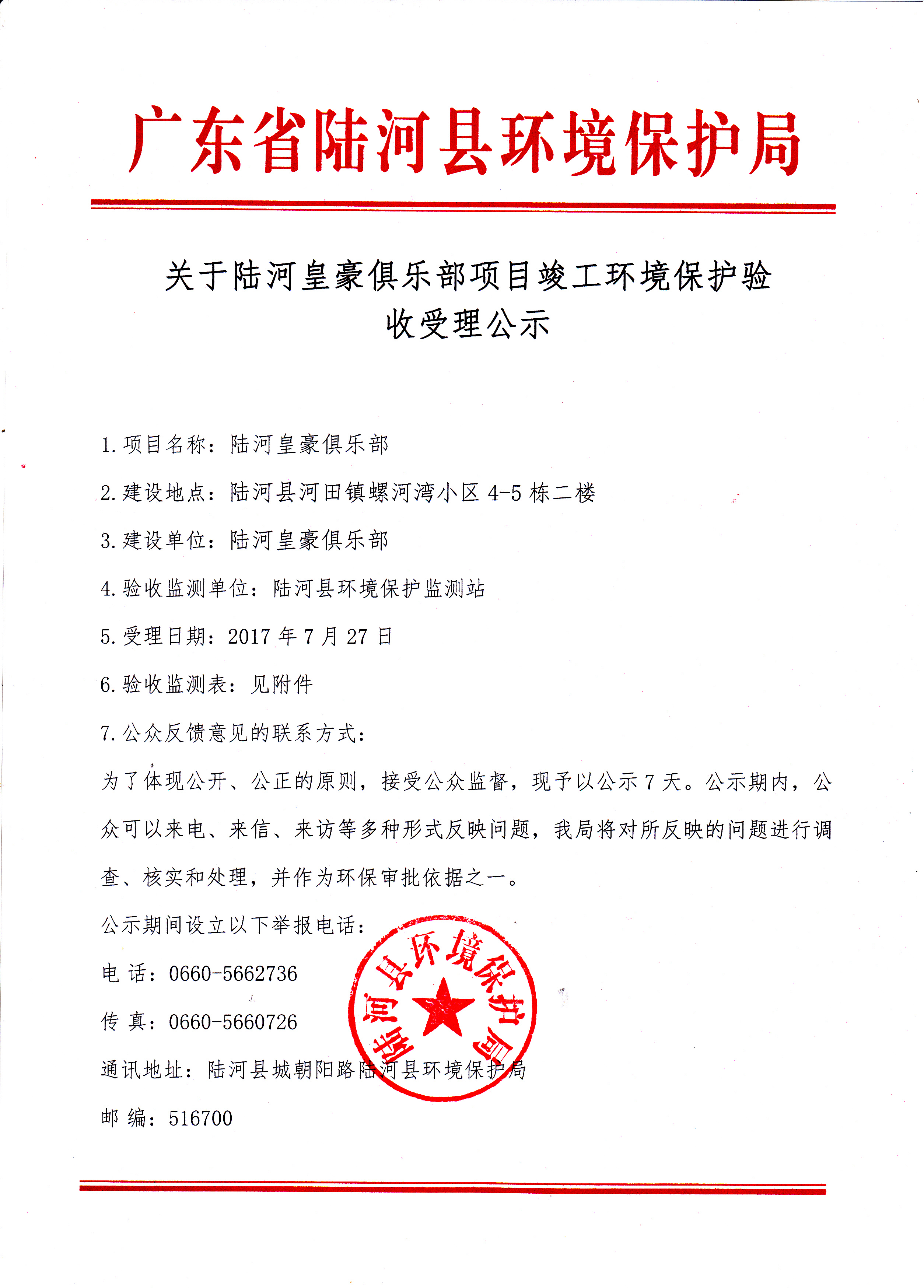 关于陆河皇豪俱乐部项目竣工环境保护验收受理公示