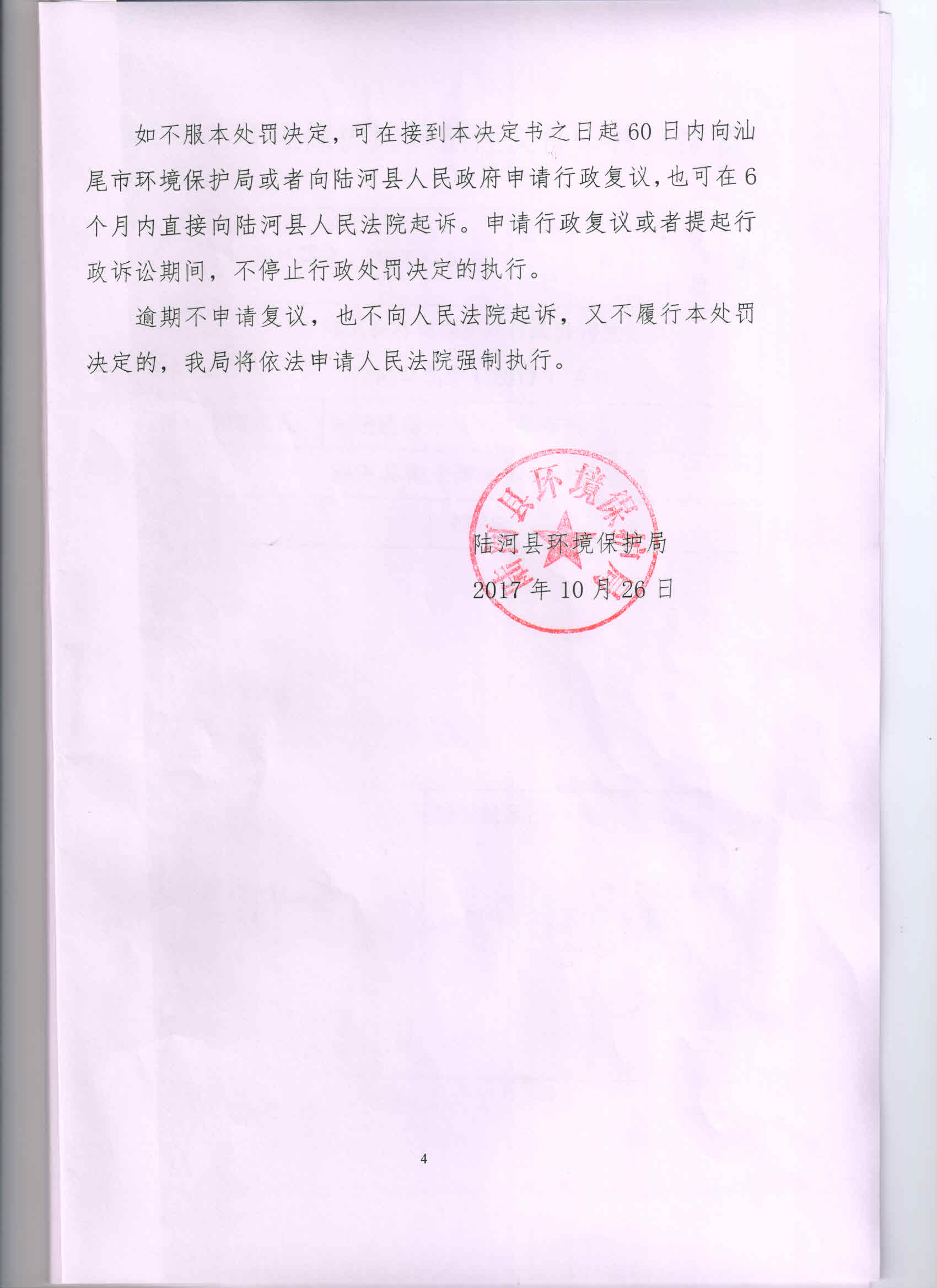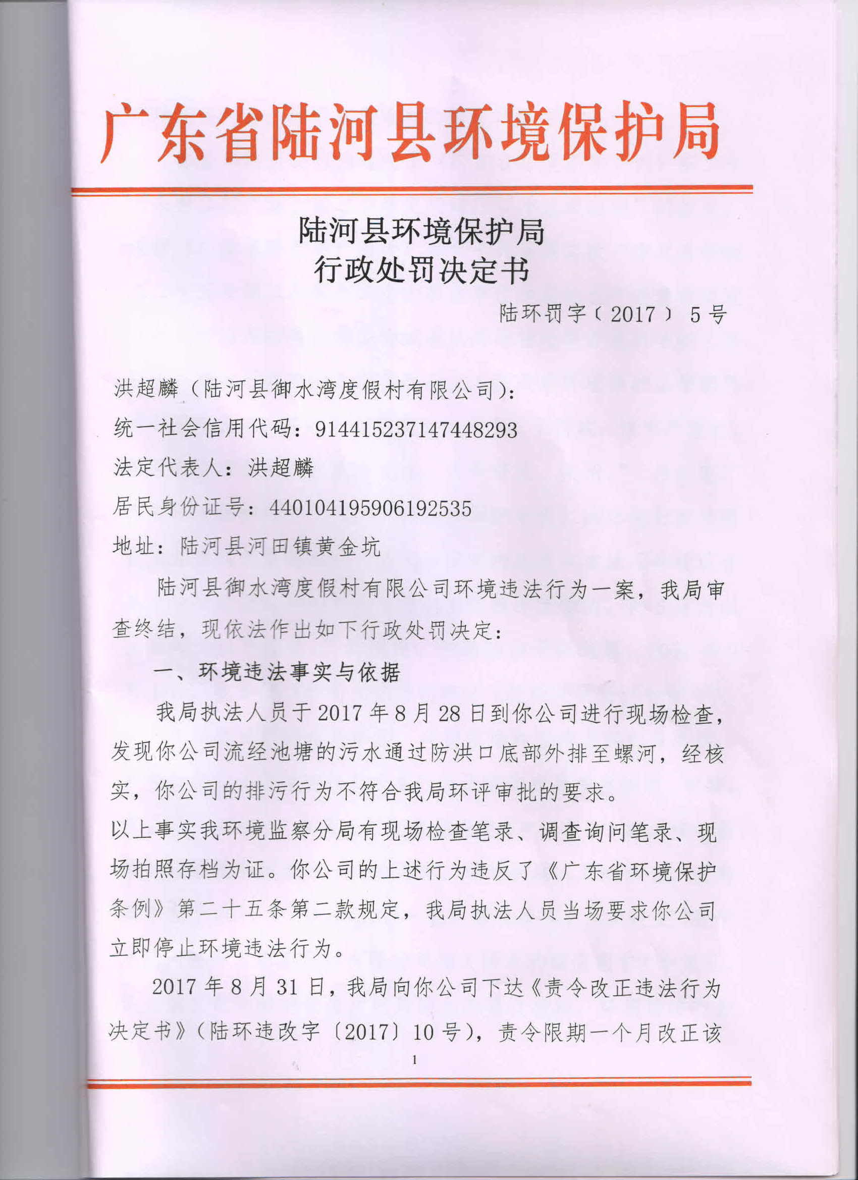 行政处罚决定书(陆河县御水湾度假村有限公司)
