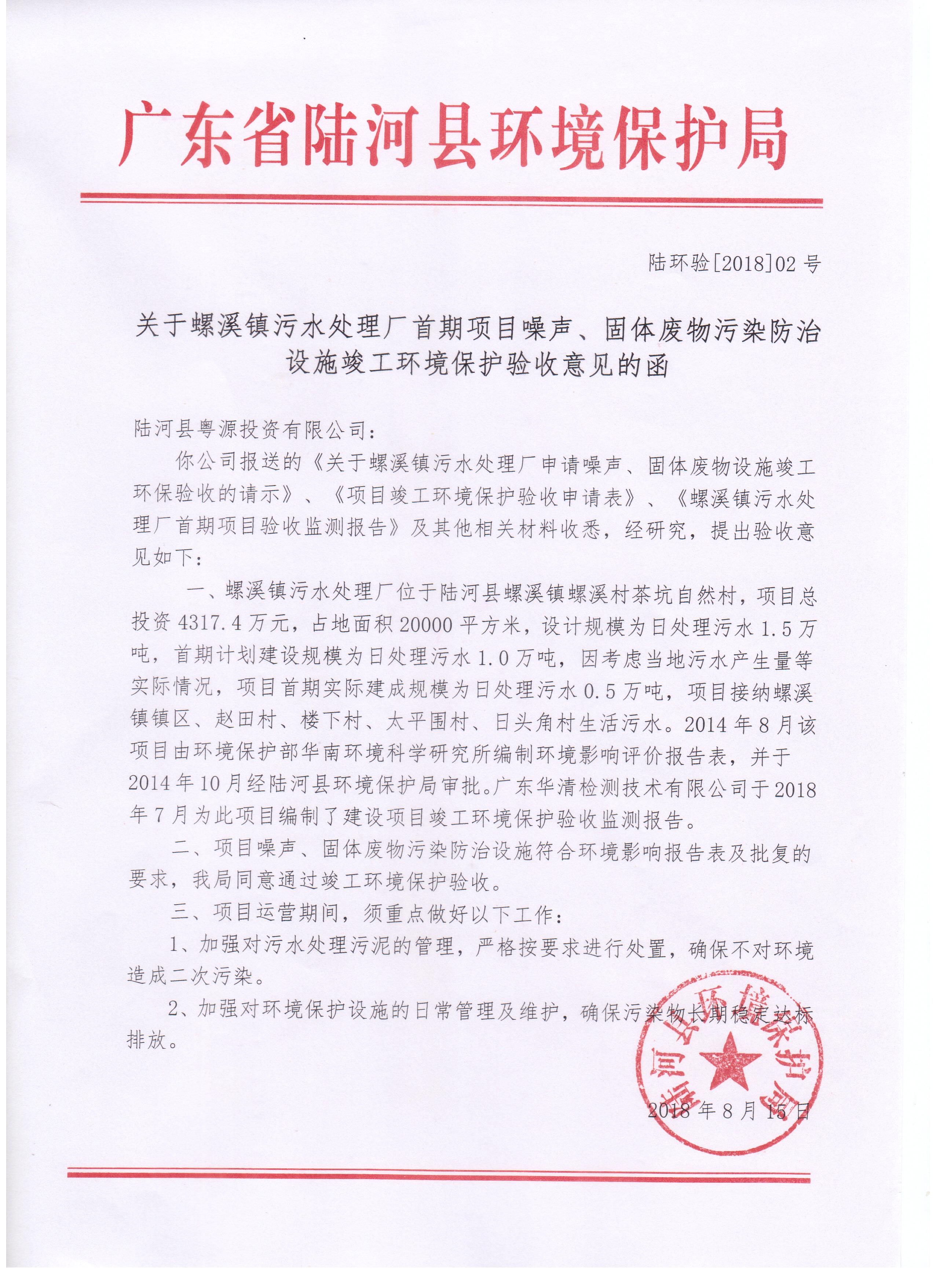 关于螺溪镇污水处理厂首期项目噪声、固体废物污染防治设施竣工环境保护验收意见的函
