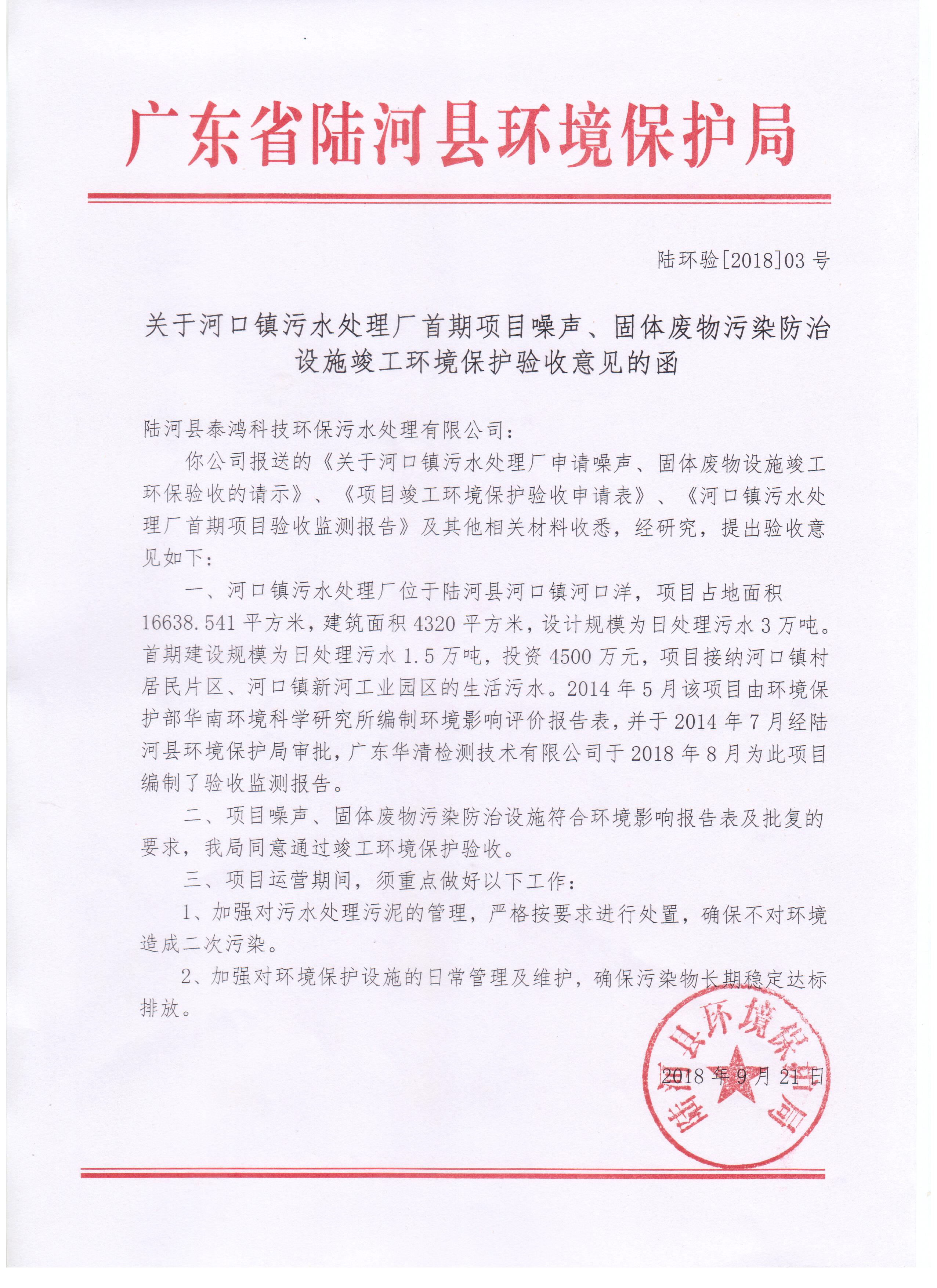 关于河口镇污水处理厂首期项目噪声、固体废物污染防治设施竣工环境保护验收意见的函