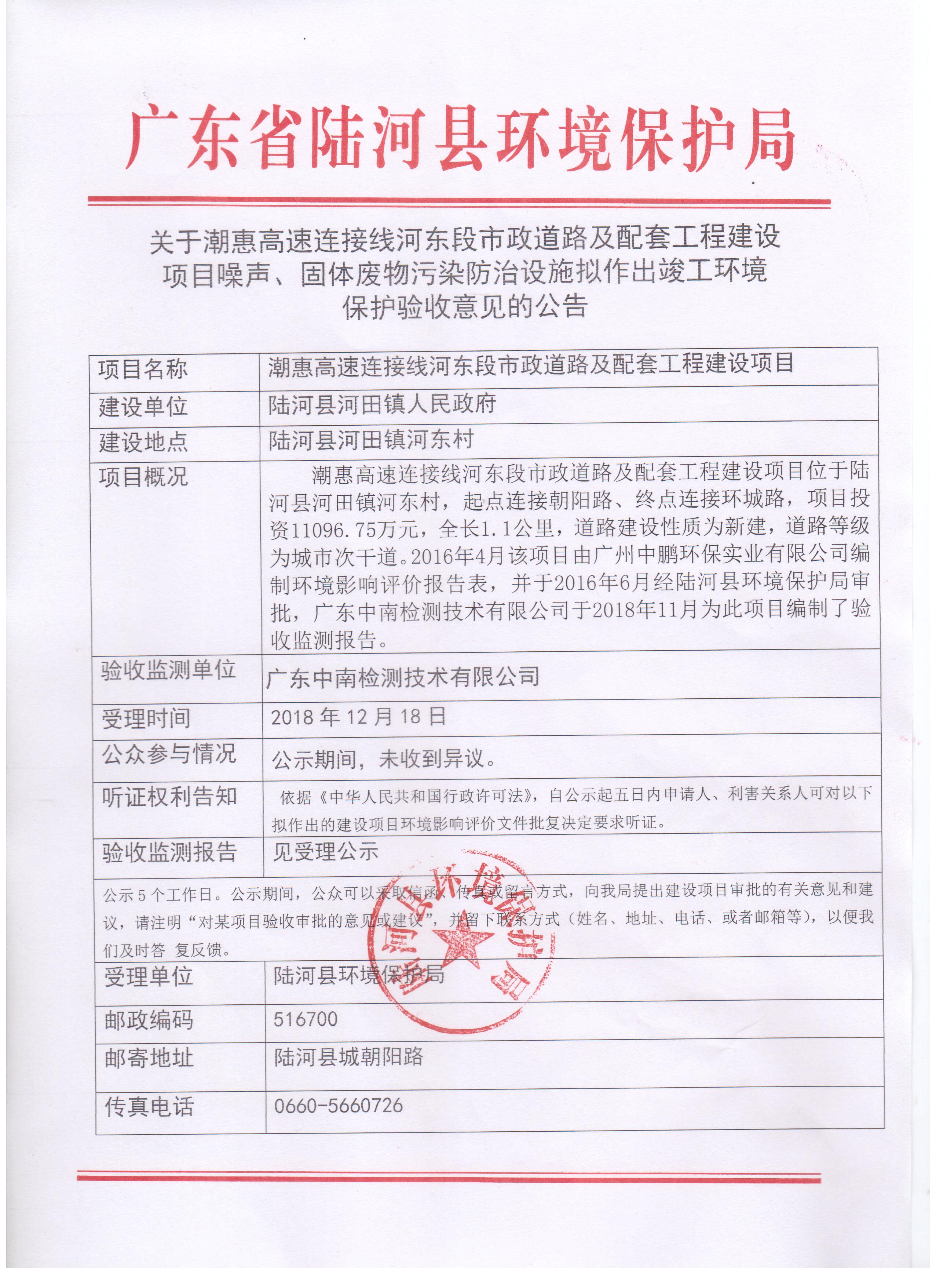 关于潮惠高速连接线河东段市政道路及配套工程建设项目噪声、固体废物污染防治设施拟作出竣工环境保护验收意见的公告
