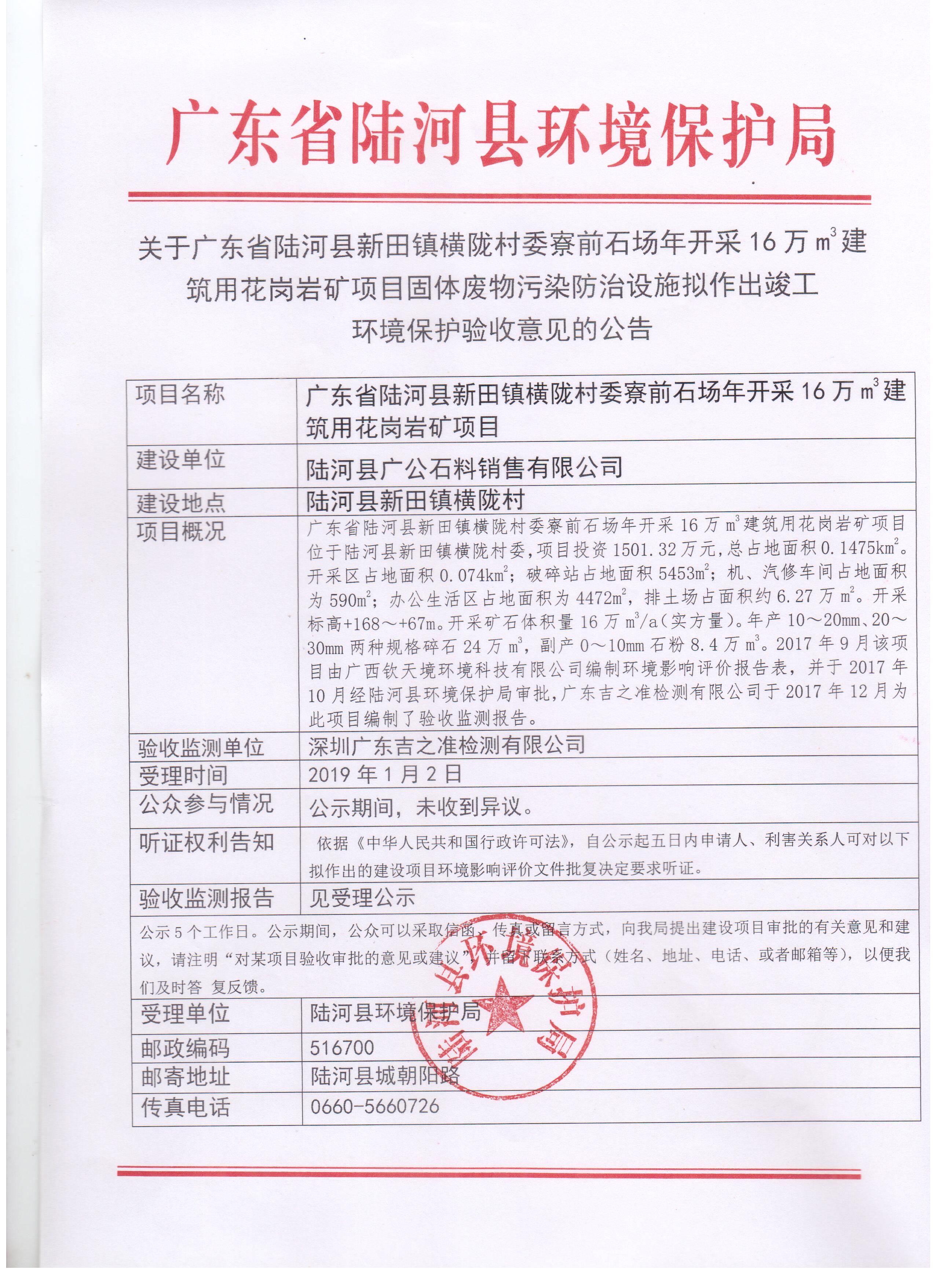 关于广东省陆河县新田镇横陇村委寮前石场年开采16万m3建筑用花岗岩矿项目固体废物污染防治设施拟作出竣工环境保护验收意见的公告
