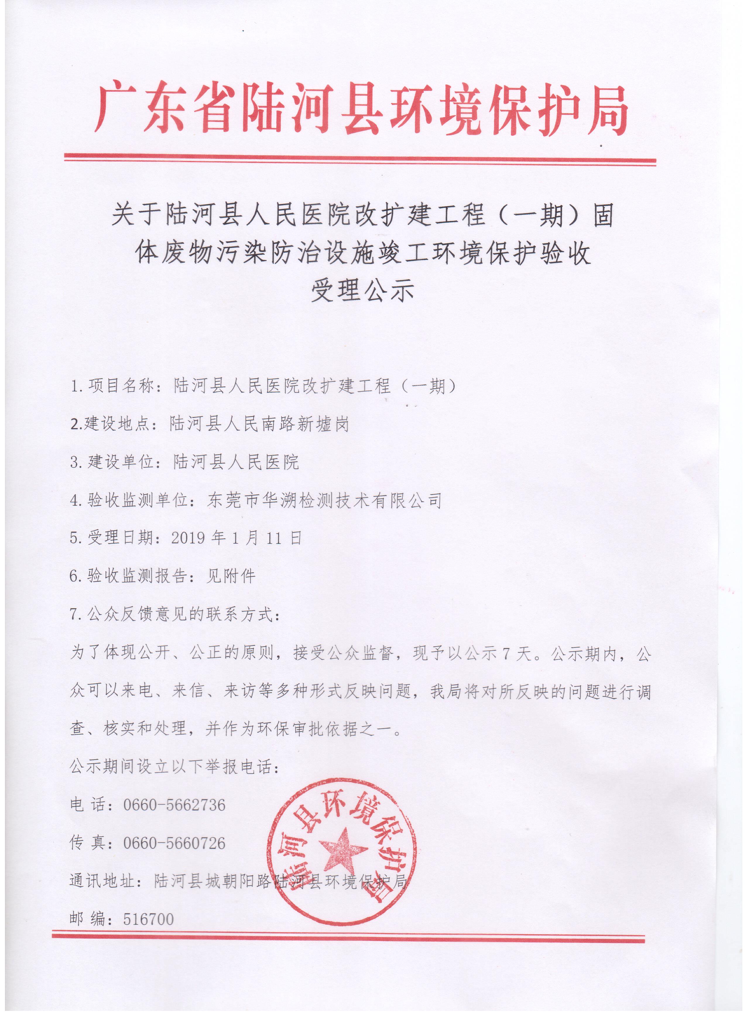 关于陆河县人民医院改扩建工程(一期)固体废物污染防治设施竣工环境保护验收受理公示