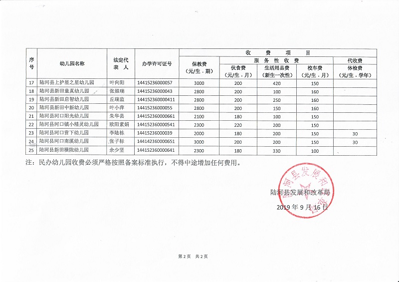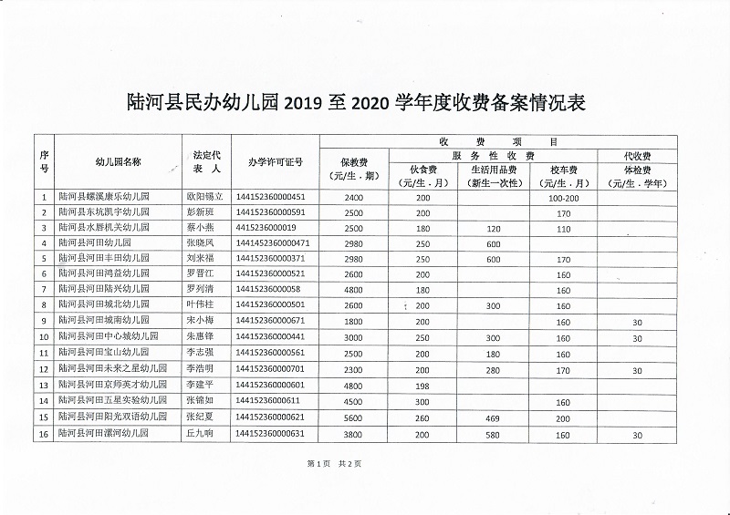 陆河县民办幼儿园2019至2020学年度收费备案情况表