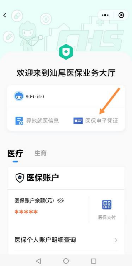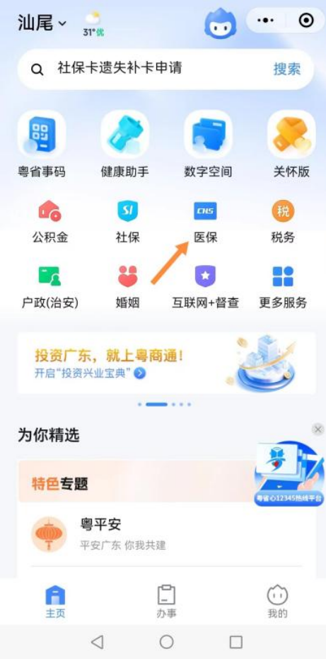 参保人通过微信搜索“粤省事”进入主界面,然后点击“医保”,进入后点击“医保电子凭证”,