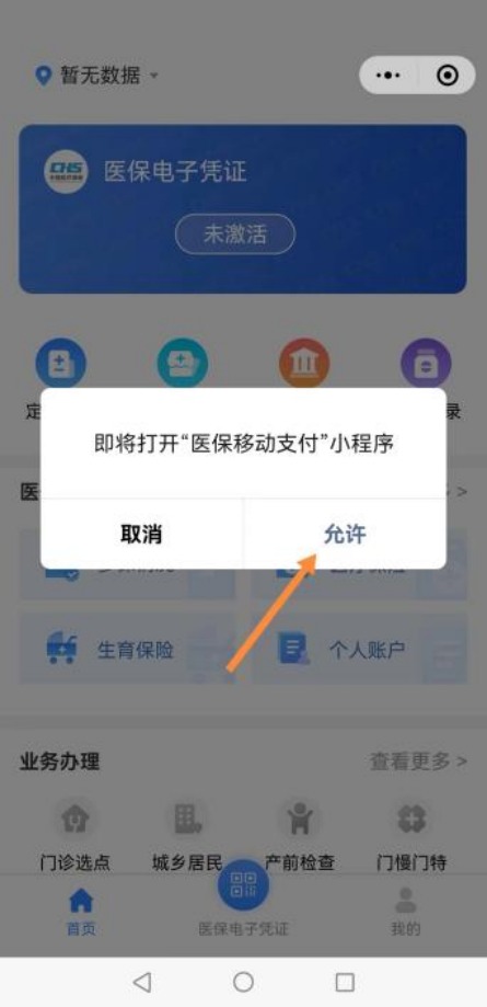 参保人通过微信APP搜索“粤医保”进入主界面,然后点击页面上方“医保电子凭证”的“未激活”,在跳出对话框中选择“允许”,再选择同意后点击“授权查询”,按程序操作即可。